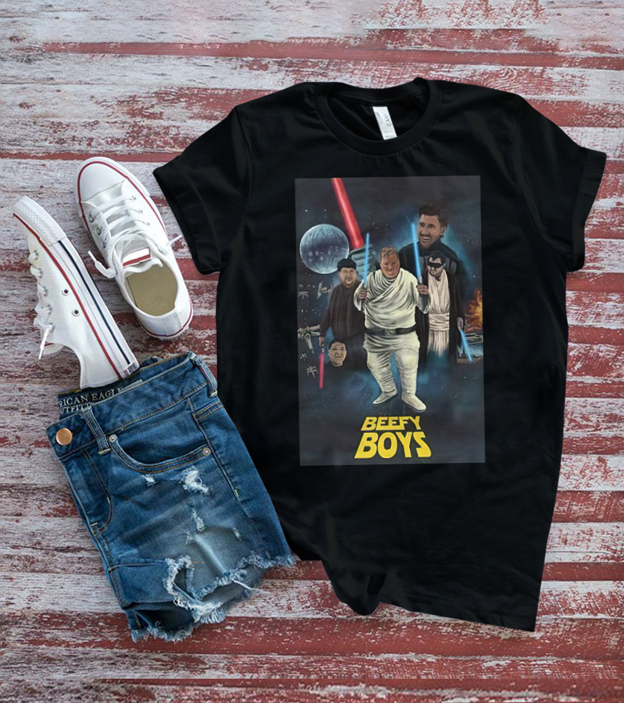 The Beefy Boys Parody Featuring Jeff Wittek Characters Lightsabers Shirt offers a regular fit. Made from 100% ring-spun cotton that is pre-shrunk to help maintain size and shape after washing. Features reinforced construction details for durability. Available in U.S. standard sizes S-5XL to accommodate various body types.