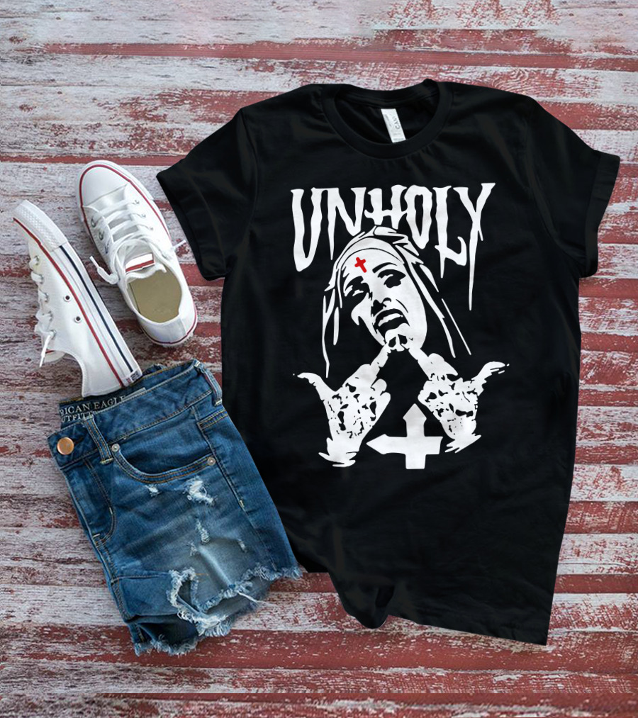 The UNHOLY Inverted Cross Nun Middle Finger Shirt offers a regular fit. Made from 100% ring-spun cotton that is pre-shrunk to help maintain size and shape after washing. Features reinforced construction details for durability. Available in U.S. standard sizes S-5XL to accommodate various body types.
