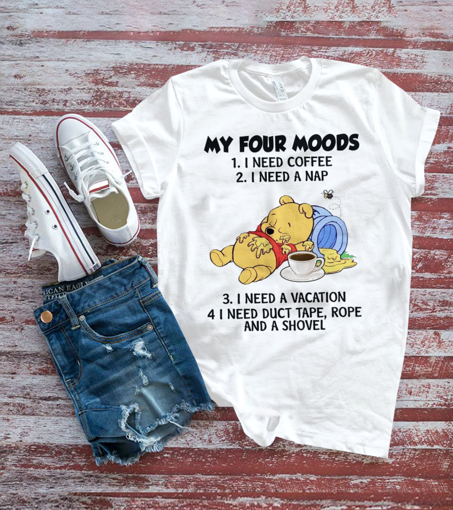 My Four Moods I Need Coffee I Need A Nap I Need A Vacation I Need Duct Tape Rope And A Shovel T-Shirt