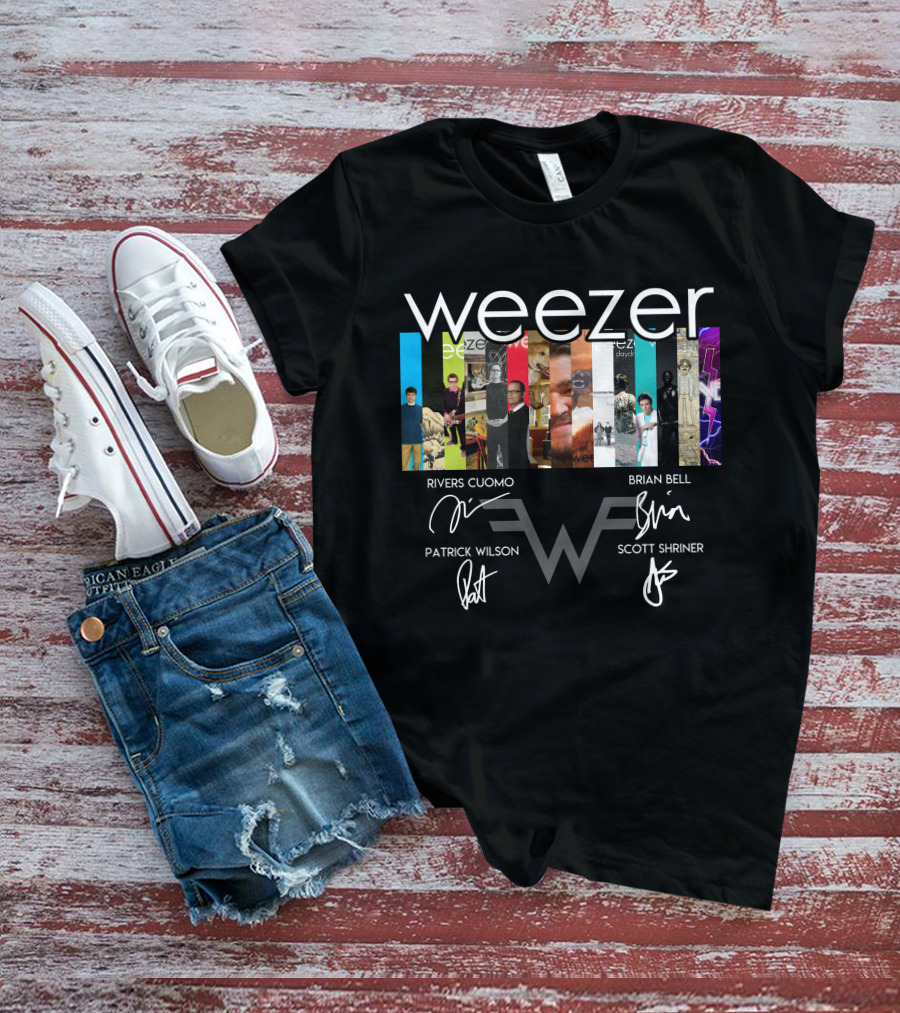 Weezer Album Collection Signatures Rivers Cuomo Brian Bell Patrick Wilson Scott Shriner T-Shirt