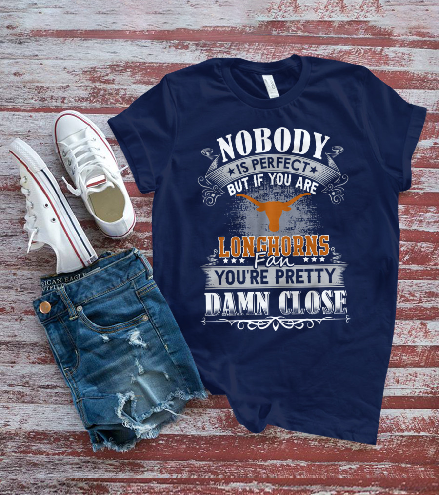 The Nobody Is Perfect But If You Are Longhorns Fan You're Pretty Damn Close Shirt offers a regular fit. Made from 100% ring-spun cotton that is pre-shrunk to help maintain size and shape after washing. Features reinforced construction details for durability. Available in U.S. standard sizes S-5XL to accommodate various body types.