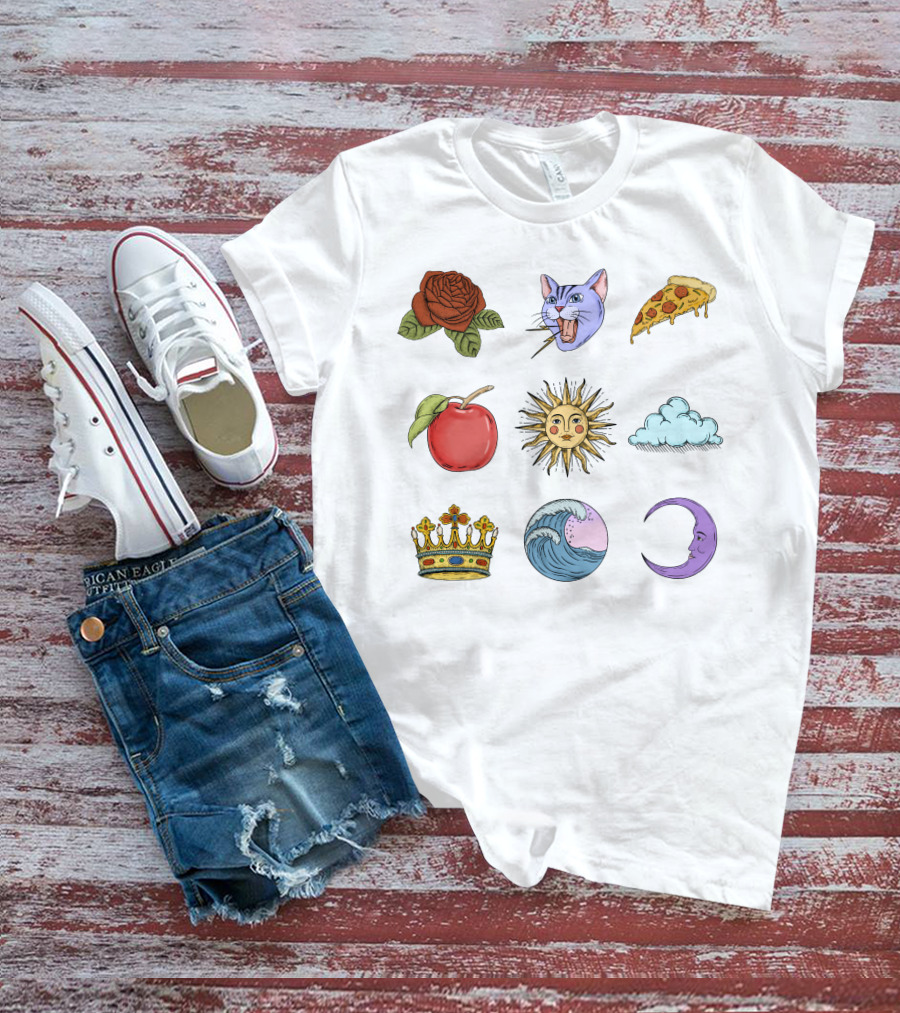 Rose Cat Pizza Apple Sun Cloud Crown Wave Moon T-Shirt