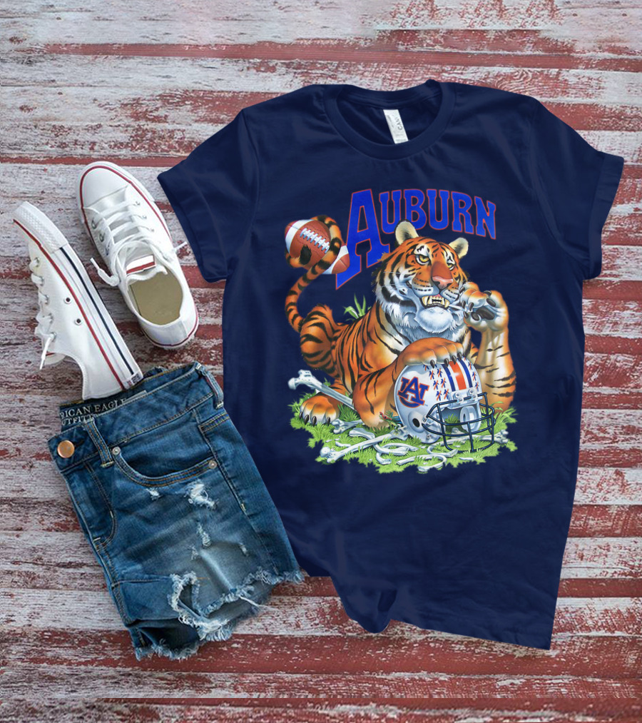 The Auburn Tigers Football Tiger Holding Helmet with Bones and Football Shirt offers a regular fit. Made from 100% ring-spun cotton that is pre-shrunk to help maintain size and shape after washing. Features reinforced construction details for durability. Available in U.S. standard sizes S-5XL to accommodate various body types.
