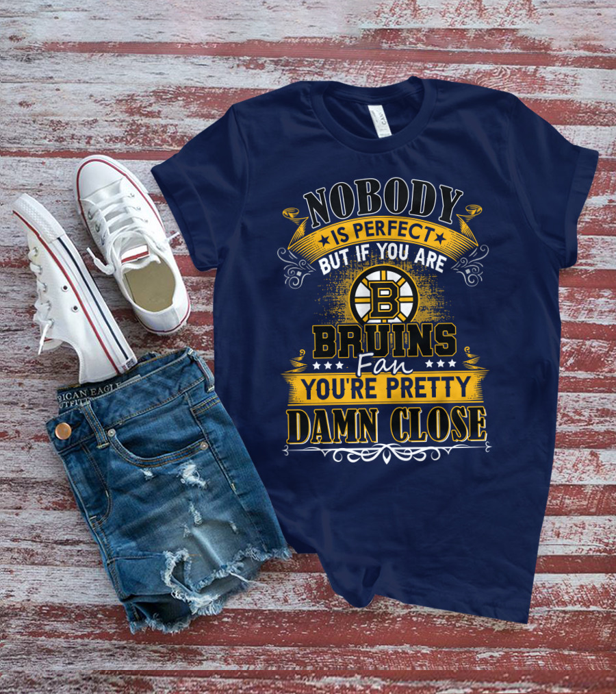 The Nobody Is Perfect But If You Are Bruins Fan You're Pretty Damn Close Shirt offers a regular fit. Made from 100% ring-spun cotton that is pre-shrunk to help maintain size and shape after washing. Features reinforced construction details for durability. Available in U.S. standard sizes S-5XL to accommodate various body types.