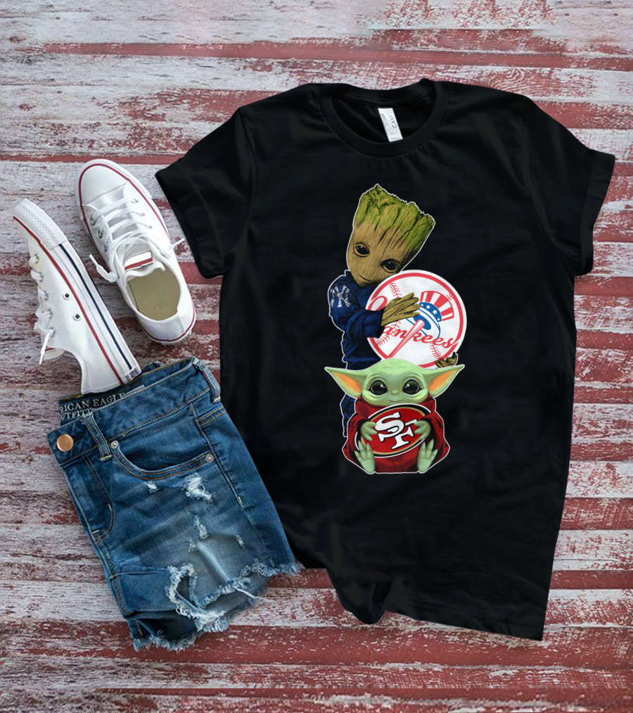 Groot Yankees Logo And Baby Yoda 49ers Sf Team Crossover T-Shirt