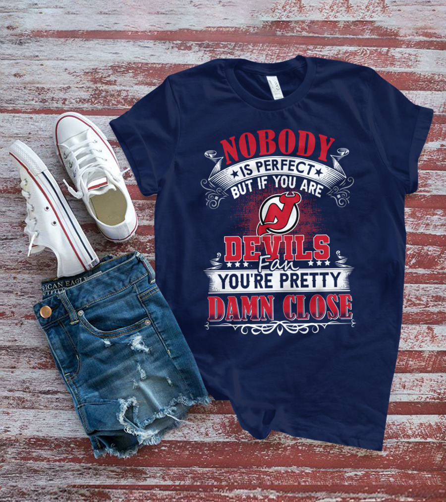The Nobody Is Perfect But If You Are New Jersey Devils Fan You're Pretty Damn Close Shirt offers a regular fit. Made from 100% ring-spun cotton that is pre-shrunk to help maintain size and shape after washing. Features reinforced construction details for durability. Available in U.S. standard sizes S-5XL to accommodate various body types.