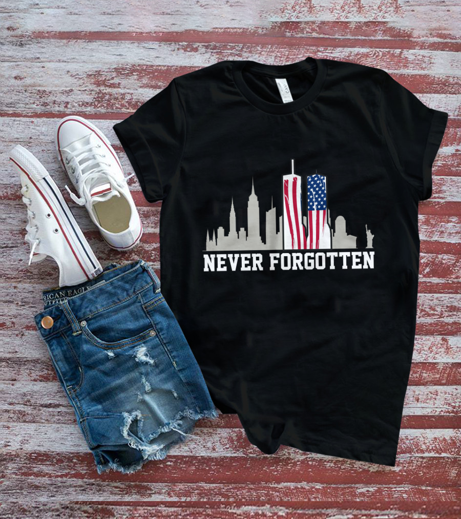 Never Forgotten September 11 Memorial 911 Twin Towers American Flag T-Shirt