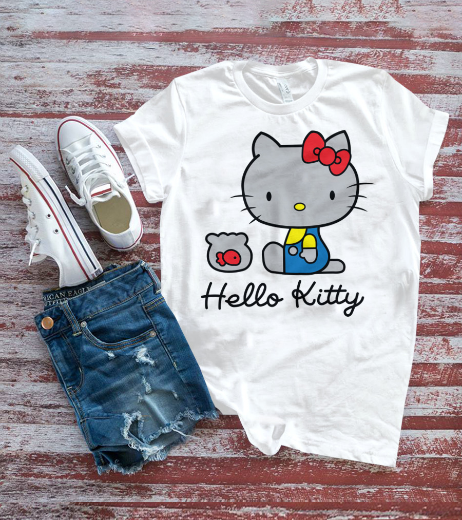 The Hello Kitty Gray Cat with Red Bow and Fish Bowl Shirt offers a regular fit. Made from 100% ring-spun cotton that is pre-shrunk to help maintain size and shape after washing. Features reinforced construction details for durability. Available in U.S. standard sizes S-5XL to accommodate various body types.