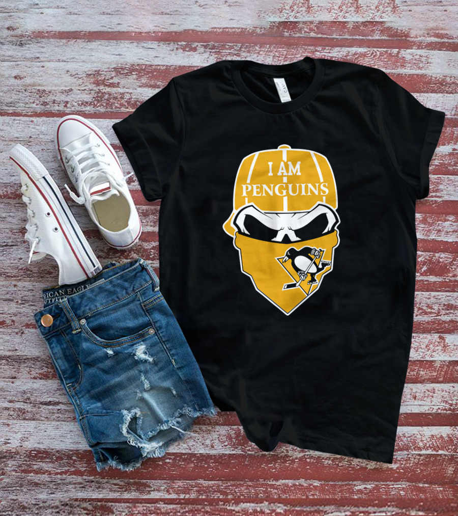 The I Am Penguins Skull Hockey Mask Shirt offers a regular fit. Made from 100% ring-spun cotton that is pre-shrunk to help maintain size and shape after washing. Features reinforced construction details for durability. Available in U.S. standard sizes S-5XL to accommodate various body types.