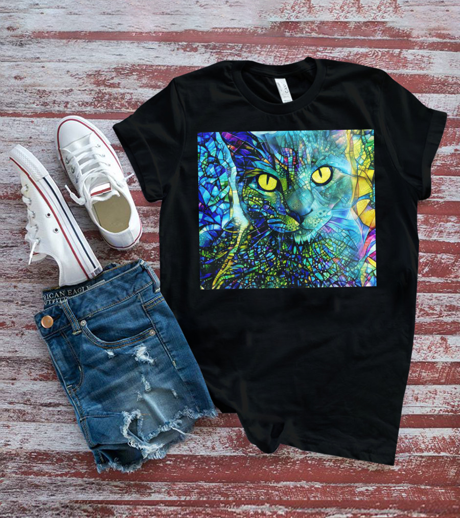 Cochfdhfdhfdh Stained Glass Mosaic Cat With Vibrant Yellow Eyes T-Shirt