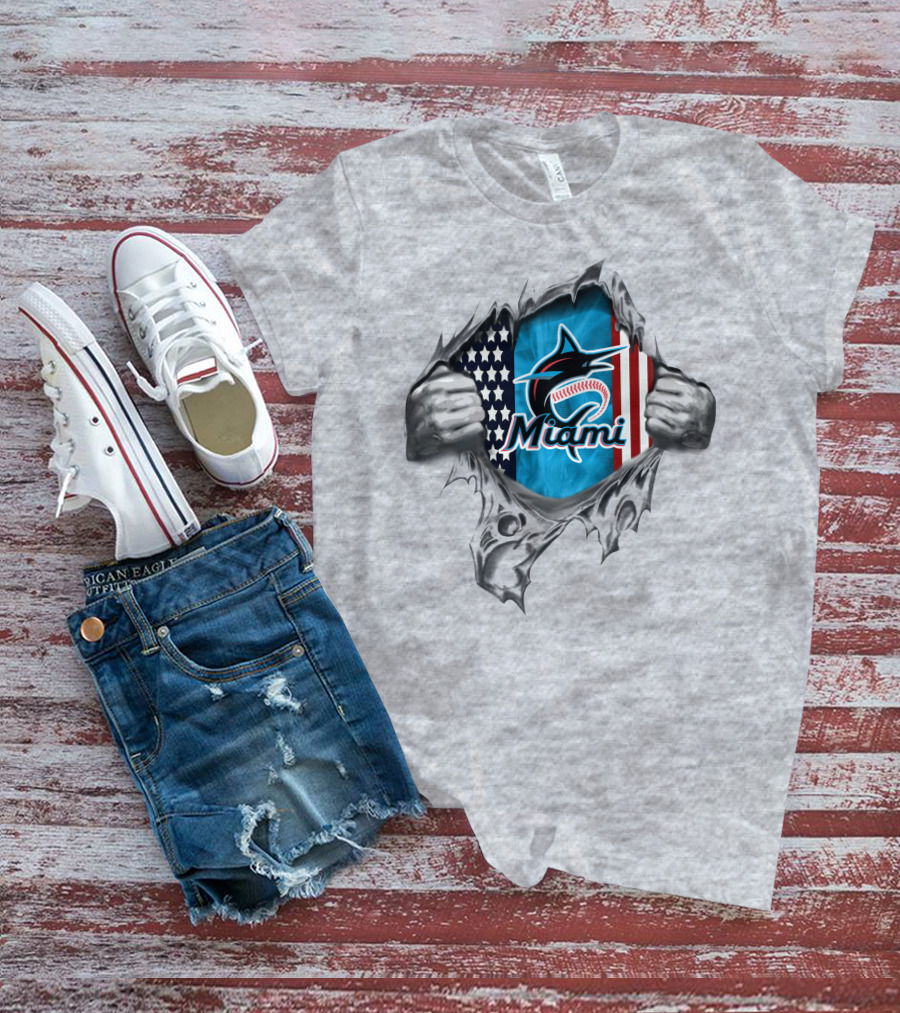 Miami Marlins American Flag Baseball Logo Tear Effect T-Shirt