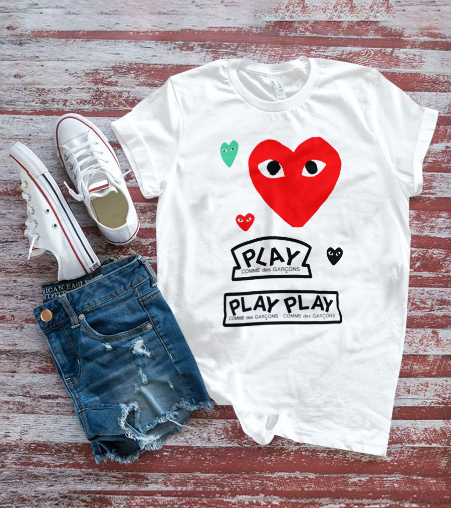 The PLAY Comme Des Garçons Heart Faces Shirt offers a regular fit. Made from 100% ring-spun cotton that is pre-shrunk to help maintain size and shape after washing. Features reinforced construction details for durability. Available in U.S. standard sizes S-5XL to accommodate various body types.