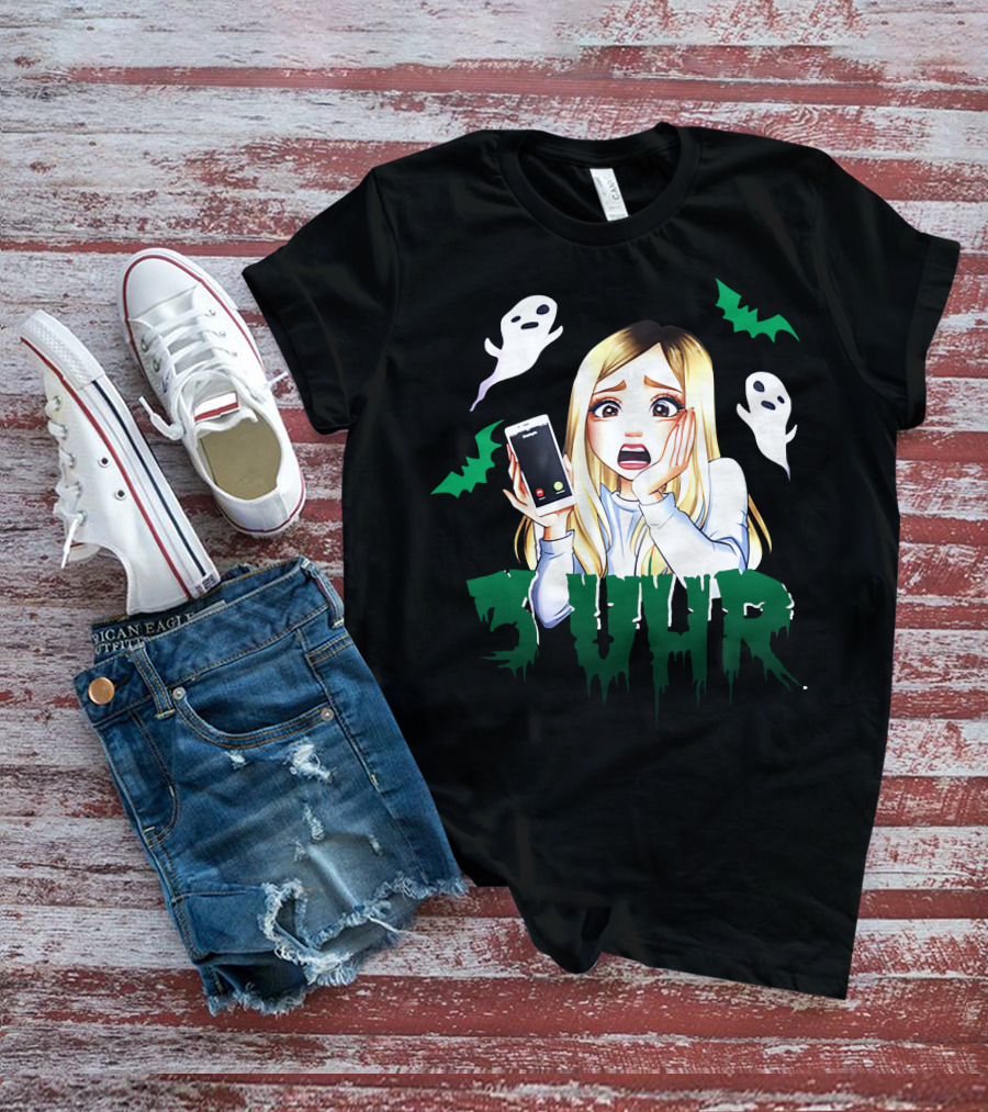 The Rebekah Wing 3 Uhr Nachts Ghosts and Bats Phone Scare Shirt offers a regular fit. Made from 100% ring-spun cotton that is pre-shrunk to help maintain size and shape after washing. Features reinforced construction details for durability. Available in U.S. standard sizes S-5XL to accommodate various body types.
