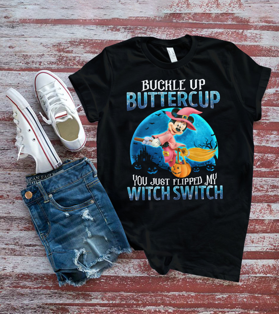 The Buckle Up Buttercup You Just Flipped My Witch Switch Minnie Shirt offers a regular fit. Made from 100% ring-spun cotton that is pre-shrunk to help maintain size and shape after washing. Features reinforced construction details for durability. Available in U.S. standard sizes S-5XL to accommodate various body types.