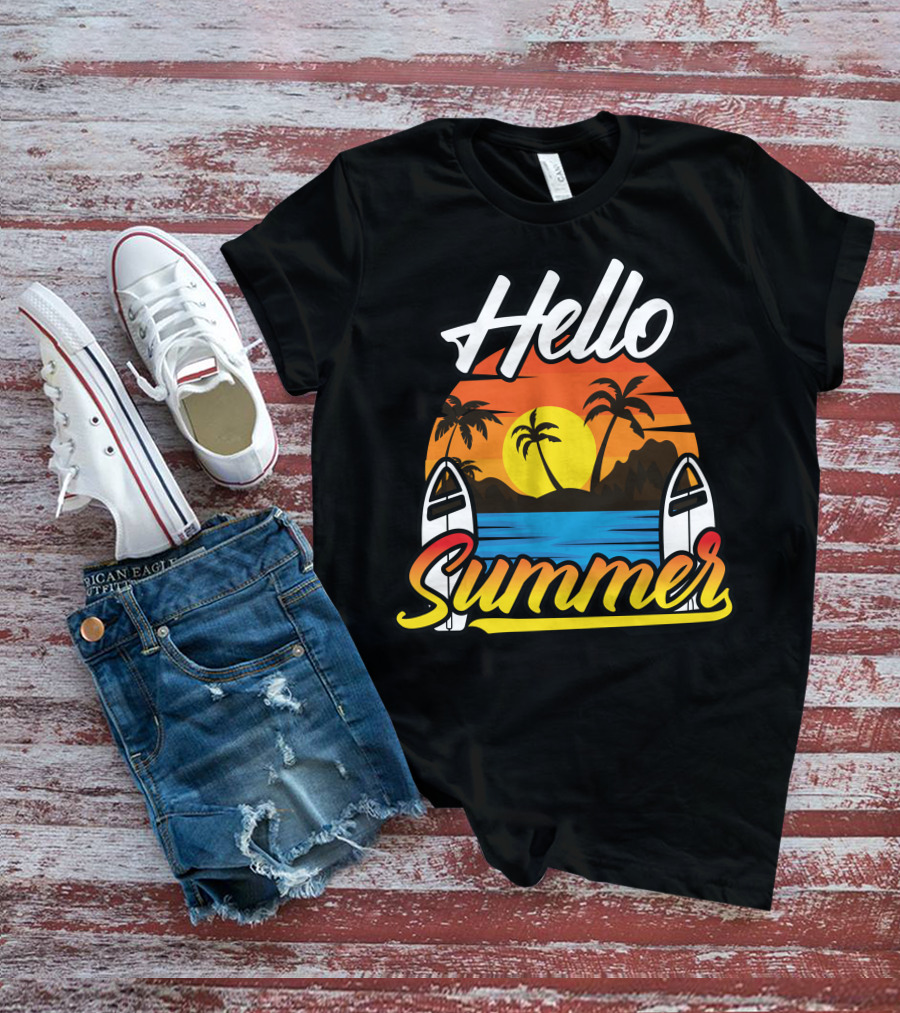Hello Summer Sunset Surfing Beach Scene T-Shirt