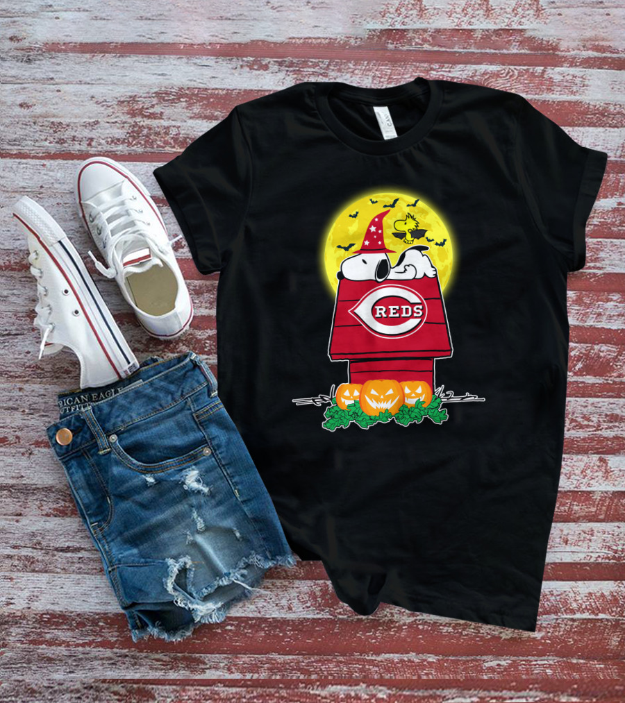 Cincinnati Reds Snoopy Halloween Doghouse Moon Pumpkins T-Shirt
