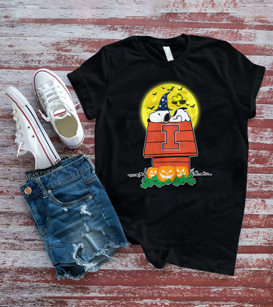 Illinois Fighting Illini Snoopy Woodstock Halloween Pumpkins Moon T-Shirt