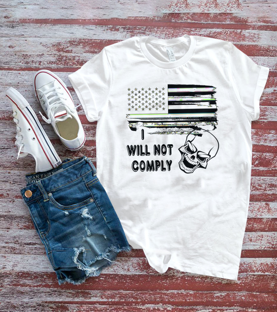 The I Will Not Comply Skull American Flag Shirt offers a regular fit. Made from 100% ring-spun cotton that is pre-shrunk to help maintain size and shape after washing. Features reinforced construction details for durability. Available in U.S. standard sizes S-5XL to accommodate various body types.
