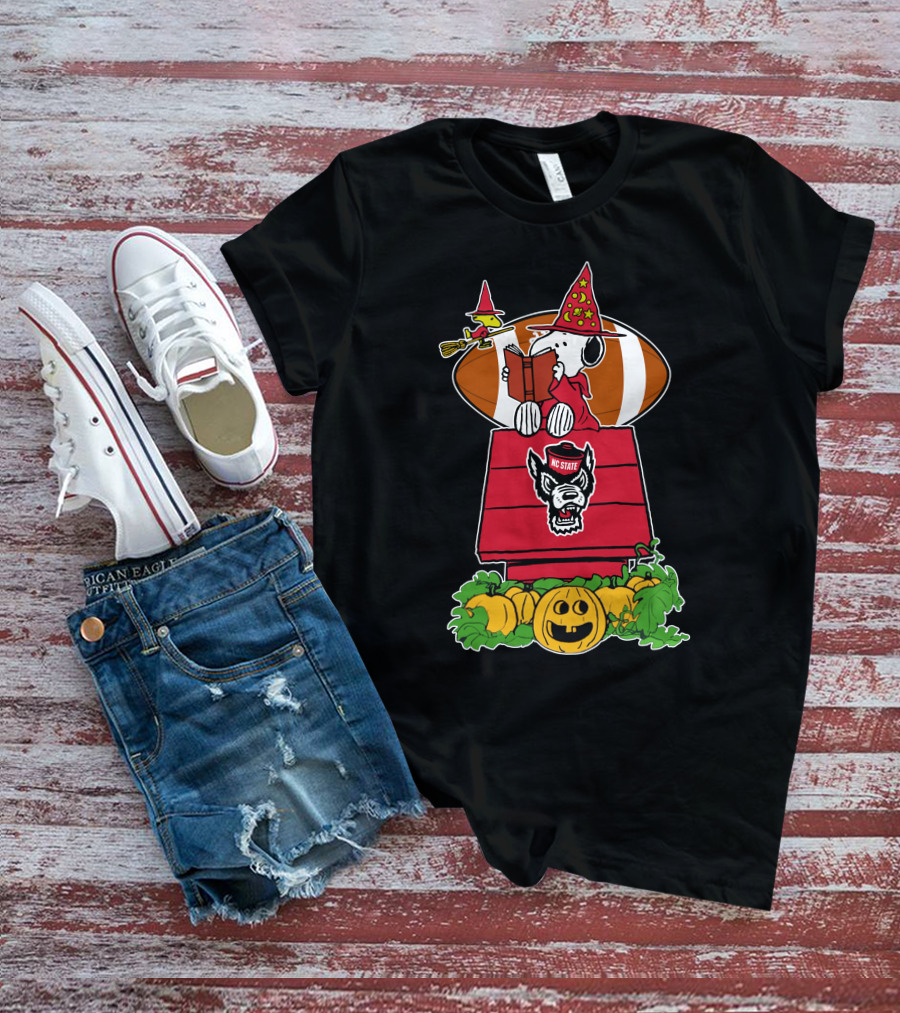 Nc State Wolfpack Snoopy Halloween Peanuts Doghouse Football Wizard Woodstock Pumpkin T-Shirt