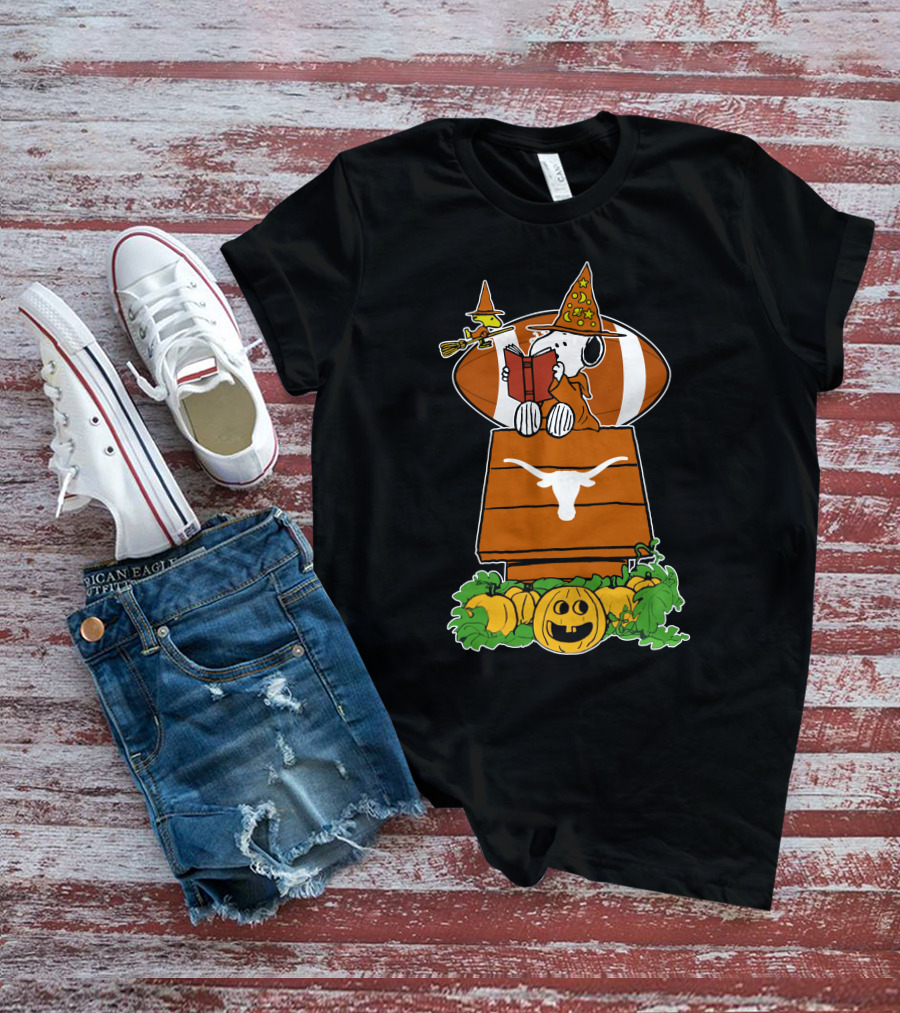 Texas Longhorns Snoopy Halloween Reading On Doghouse With Witch Woodstocks And Pumpkin T-Shirt
