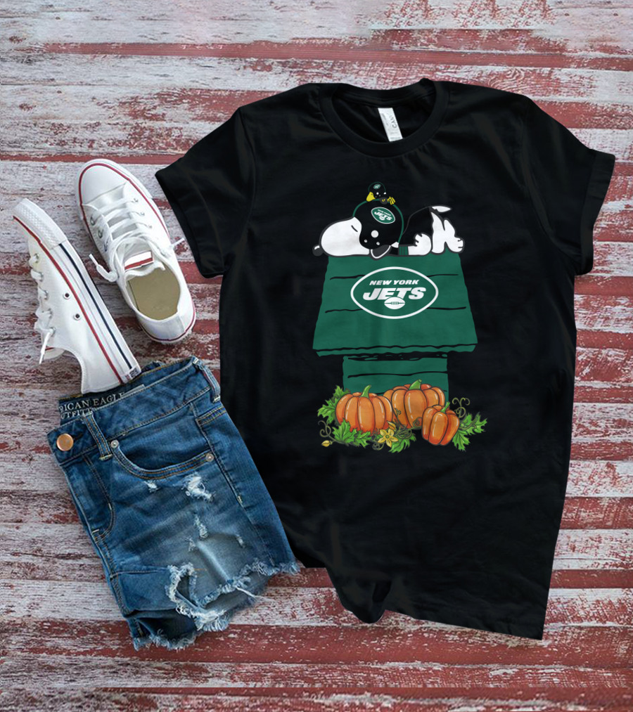 New York Jets Snoopy Resting On Pumpkin Doghouse T-Shirt