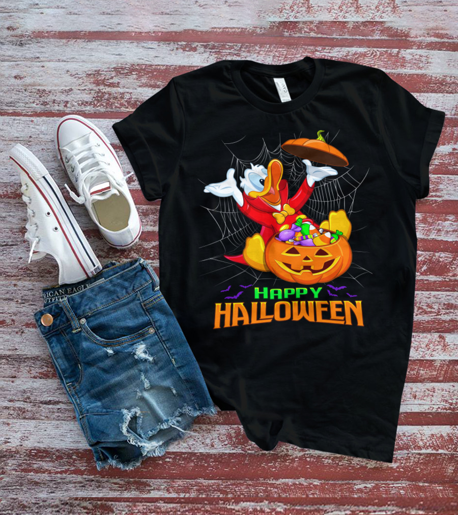 Happy Halloween Donald Duck In Pumpkin Suit With Candy And Spiderweb T-Shirt