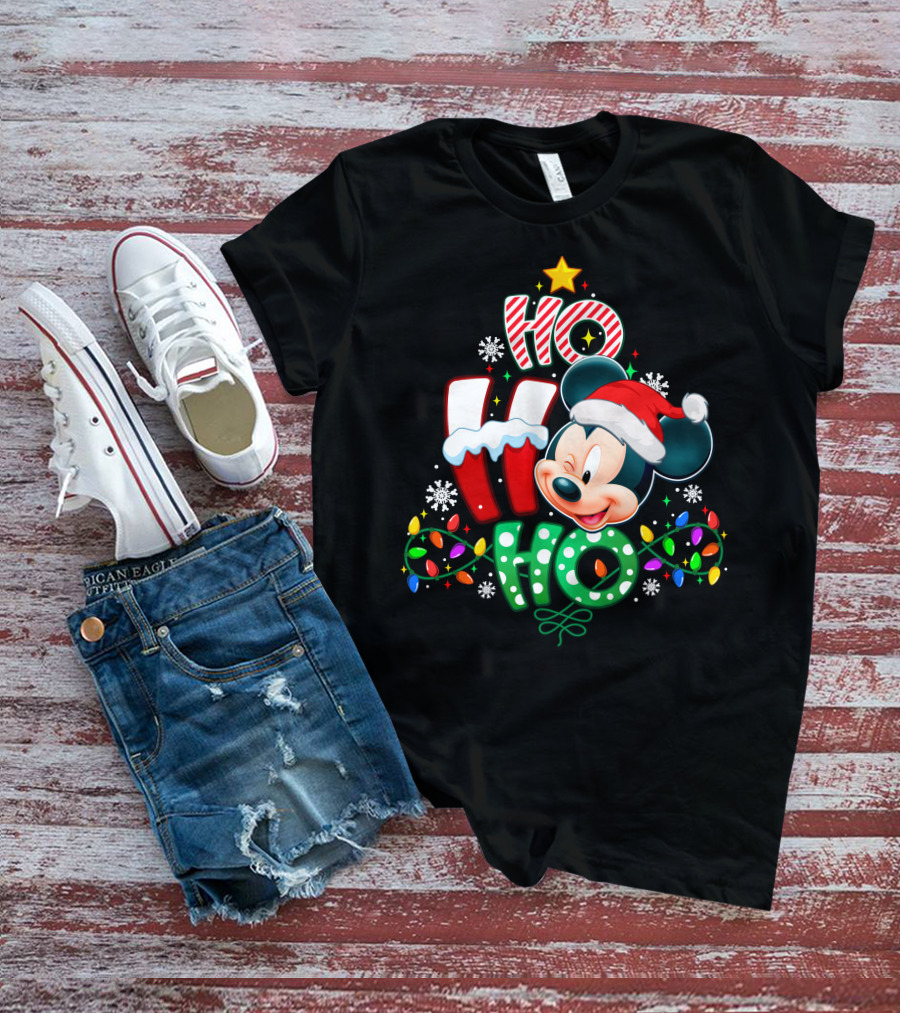 Mickey Ho Ho Ho Christmas Lights Snowflakes Santa Hat T-Shirt