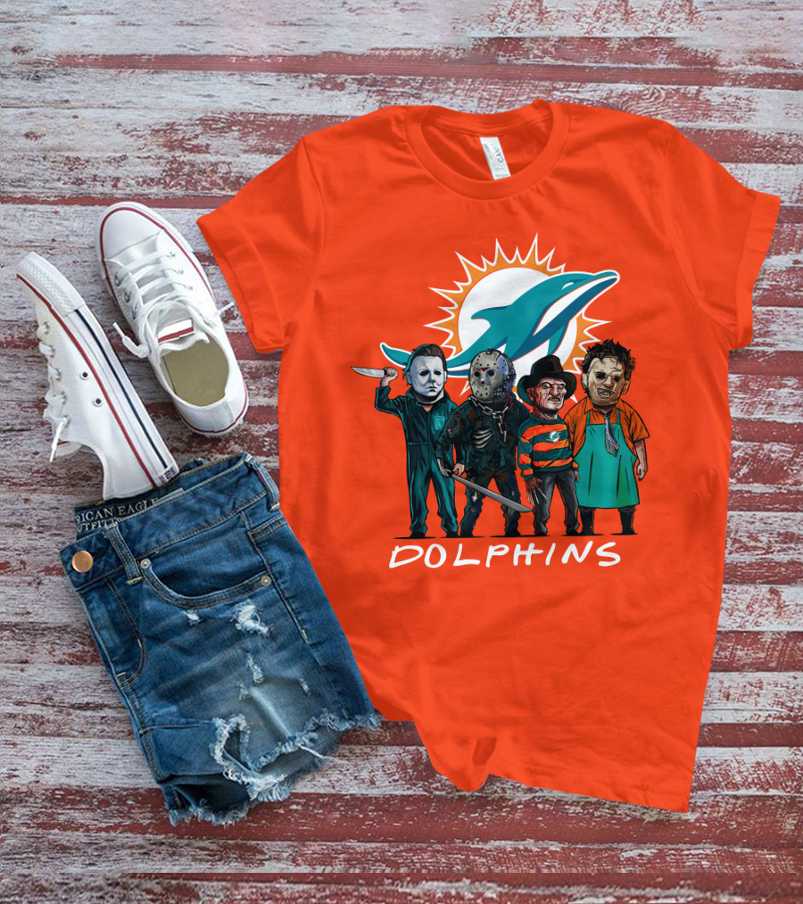 The Miami Dolphins Halloween The Slasher Squad Teams Horror Characters Shirt offers a regular fit. Made from 100% ring-spun cotton that is pre-shrunk to help maintain size and shape after washing. Features reinforced construction details for durability. Available in U.S. standard sizes S-5XL to accommodate various body types.