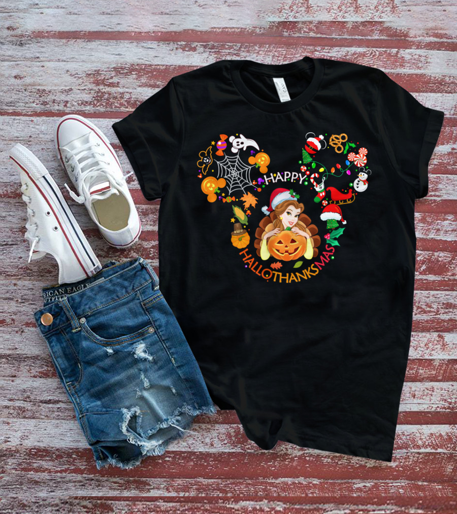 Happy Hallothanksmas Belle Pumpkin Mickey Ears Holiday Spirits T-Shirt