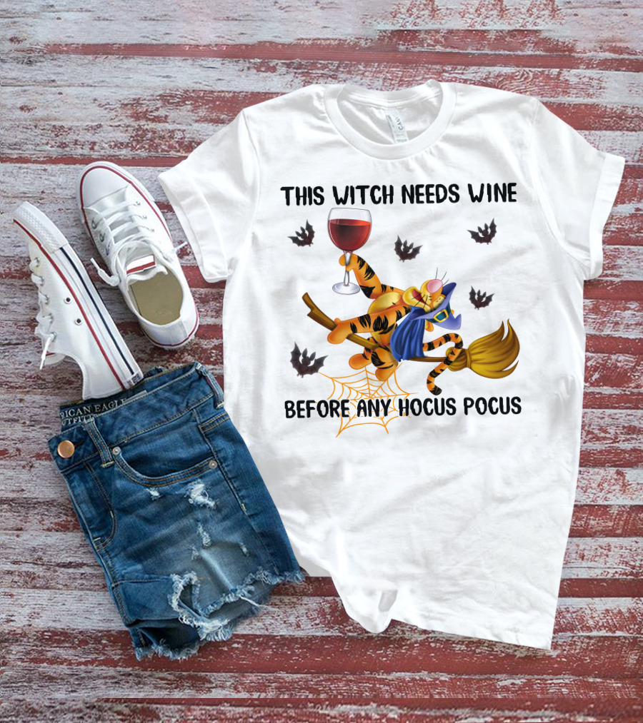 This Witch Needs Wine Before Any Hocus Pocus Tigger Broomstick And Wine Glass Halloween Bat Spiderweb T-Shirt