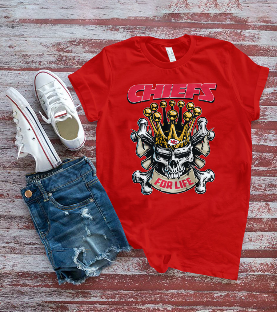 The Chiefs Skull King Crown For Life Shirt offers a regular fit. Made from 100% ring-spun cotton that is pre-shrunk to help maintain size and shape after washing. Features reinforced construction details for durability. Available in U.S. standard sizes S-5XL to accommodate various body types.