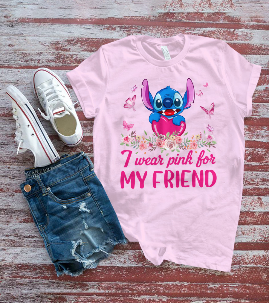 The Stitch I Wear Pink For My Friend Shirt offers a regular fit. Made from 100% ring-spun cotton that is pre-shrunk to help maintain size and shape after washing. Features reinforced construction details for durability. Available in U.S. standard sizes S-5XL to accommodate various body types.