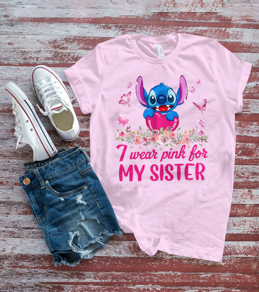 I Wear Pink For My Sister Stitch Butterfly Flower Theme T-Shirt