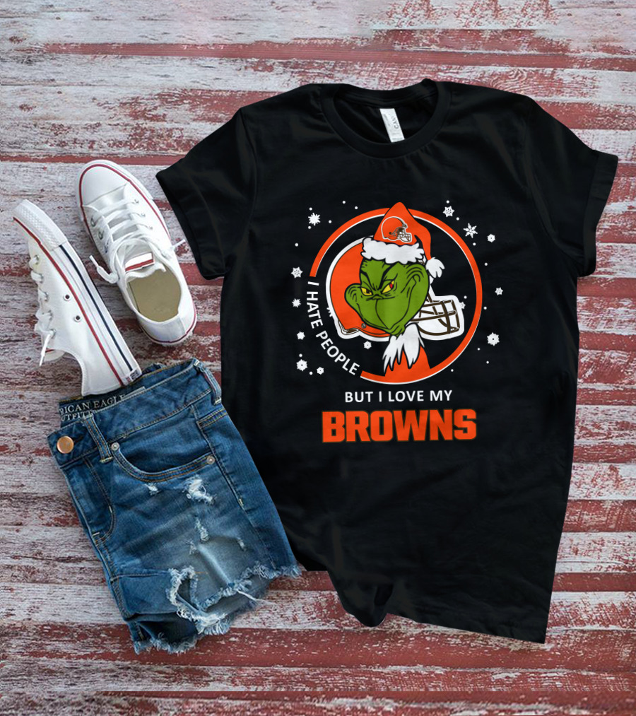 I Hate People But I Love My Browns Cleveland Browns Grinch Santa Hat Snowflakes T-Shirt