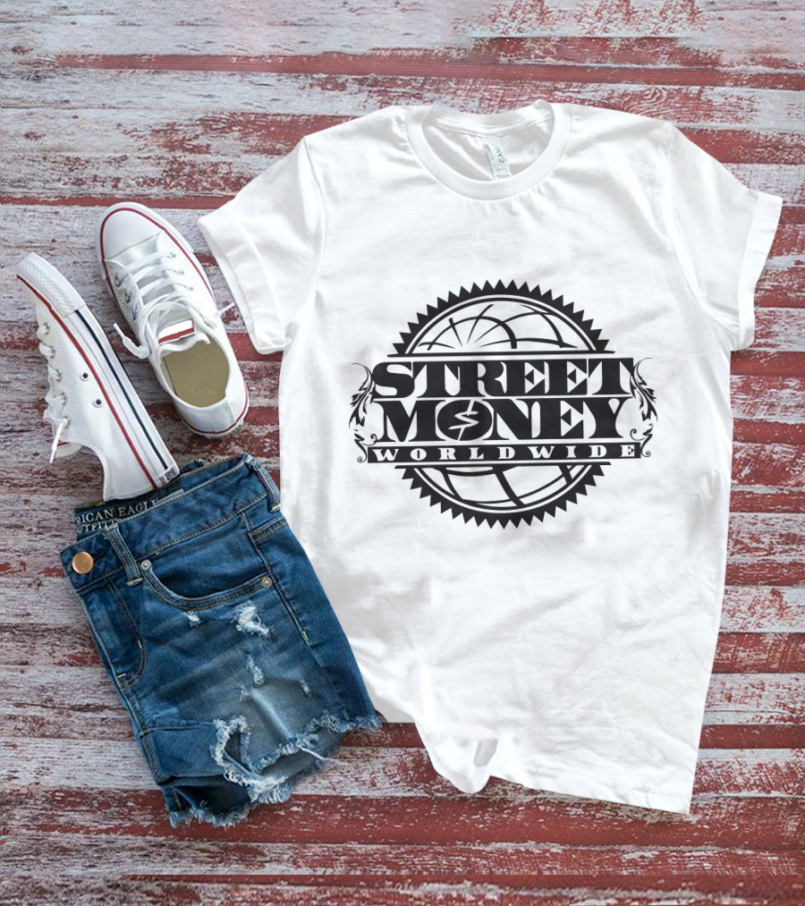 The STREET MONEY WORLDWIDE Globe Emblem with Stylized Dollar Shirt offers a regular fit. Made from 100% ring-spun cotton that is pre-shrunk to help maintain size and shape after washing. Features reinforced construction details for durability. Available in U.S. standard sizes S-5XL to accommodate various body types.