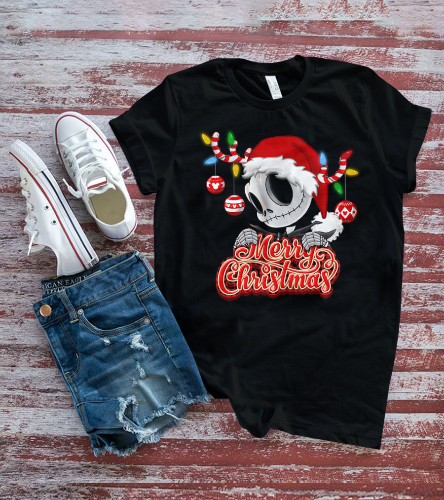 Merry Christmas Santa Jack Skellington With Candy Cane Lights And Ornaments T-Shirt
