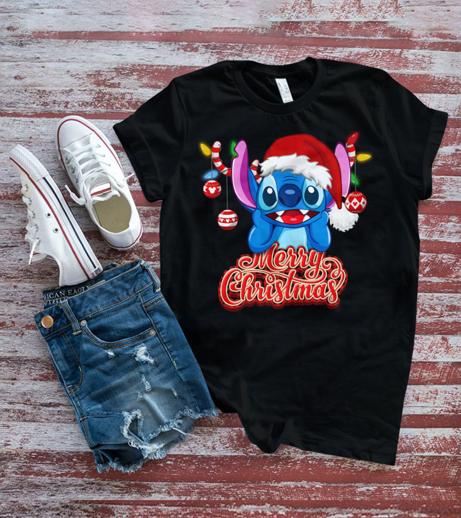 The Merry Christmas Stitch Santa Hat Ornaments Shirt offers a regular fit. Made from 100% ring-spun cotton that is pre-shrunk to help maintain size and shape after washing. Features reinforced construction details for durability. Available in U.S. standard sizes S-5XL to accommodate various body types.