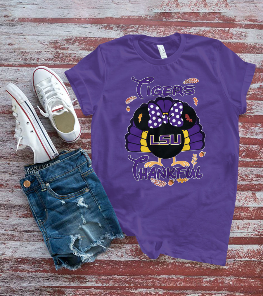 The LSU Tigers Thankful Minnie Thanksgiving Shirt offers a regular fit. Made from 100% ring-spun cotton that is pre-shrunk to help maintain size and shape after washing. Features reinforced construction details for durability. Available in U.S. standard sizes S-5XL to accommodate various body types.