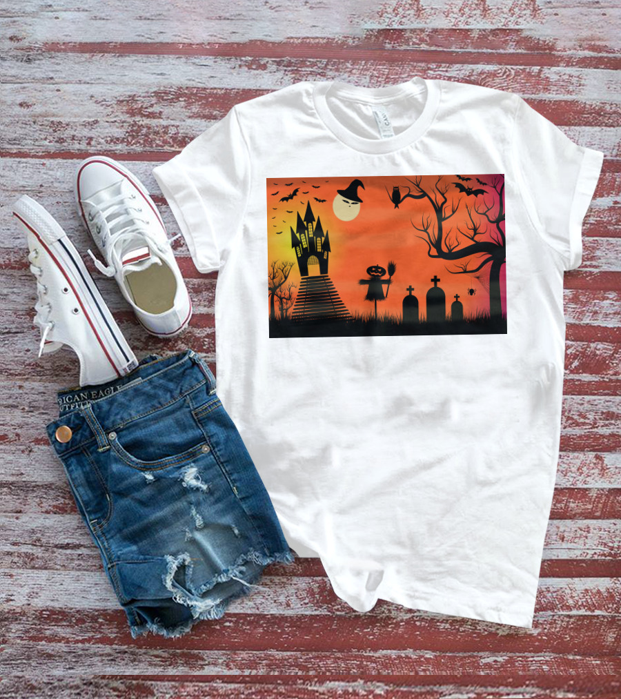The Halloween Haunted Castle Silhouette with Bats and Graveyard Scene Shirt offers a regular fit. Made from 100% ring-spun cotton that is pre-shrunk to help maintain size and shape after washing. Features reinforced construction details for durability. Available in U.S. standard sizes S-5XL to accommodate various body types.
