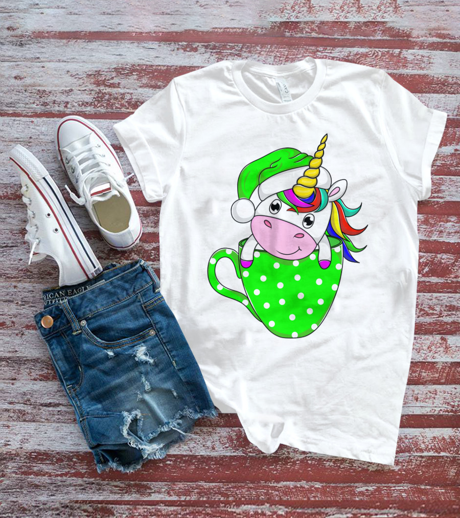 Funny Christmas Unicorn In Santa Hat With Green Polka Dot Cup T-Shirt