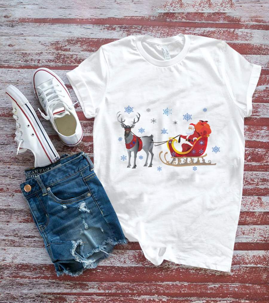 The Christmas Santa with Reindeer and Sleigh Surrounded by Snowflakes Shirt offers a regular fit. Made from 100% ring-spun cotton that is pre-shrunk to help maintain size and shape after washing. Features reinforced construction details for durability. Available in U.S. standard sizes S-5XL to accommodate various body types.