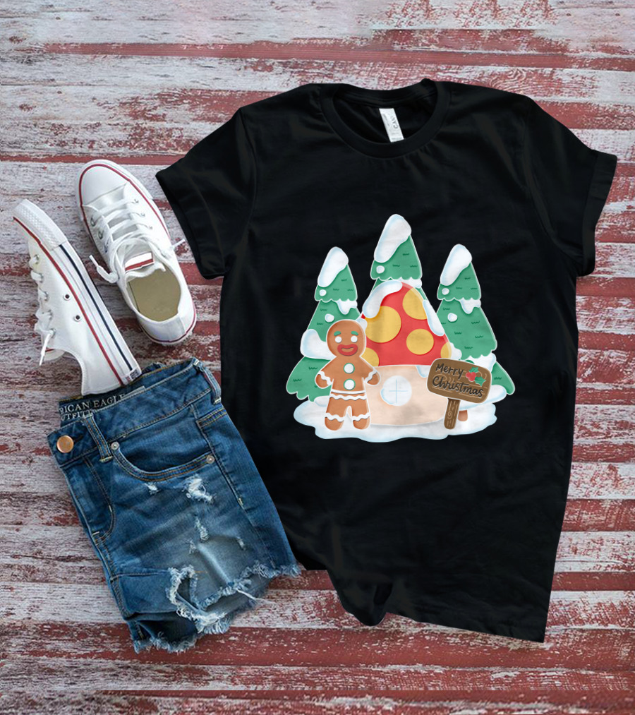 Merry Christmas Gingerman House With Snowy Trees And Mushroom Roof T-Shirt