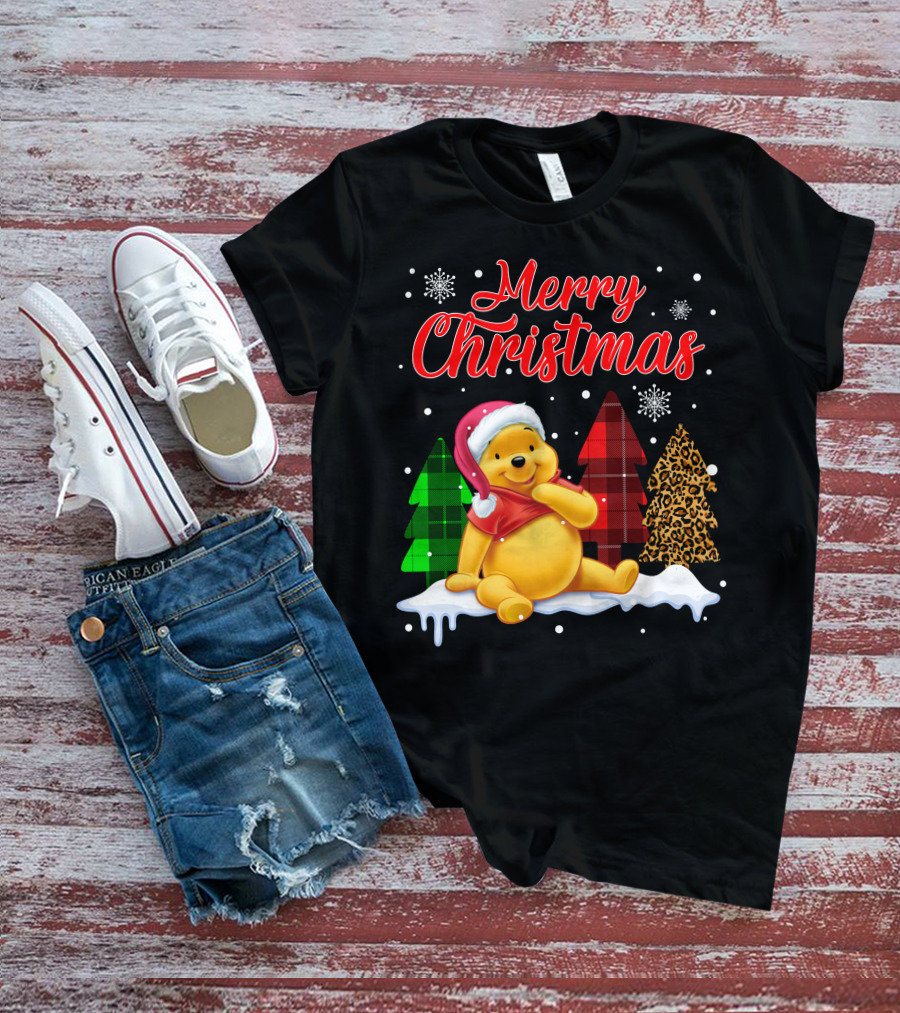 Merry Christmas Pooh Snowflakes Plaid Trees Santa Hat T-Shirt