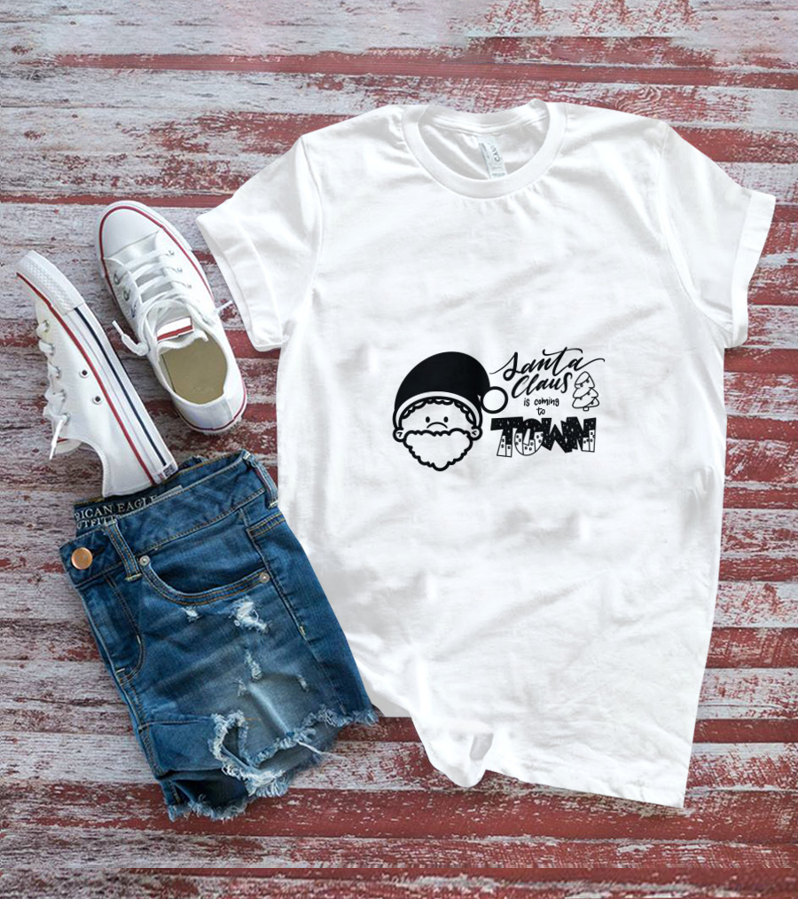 Santa Claus Is Coming To Town Festive Santa Face And Christmas Trees T-Shirt