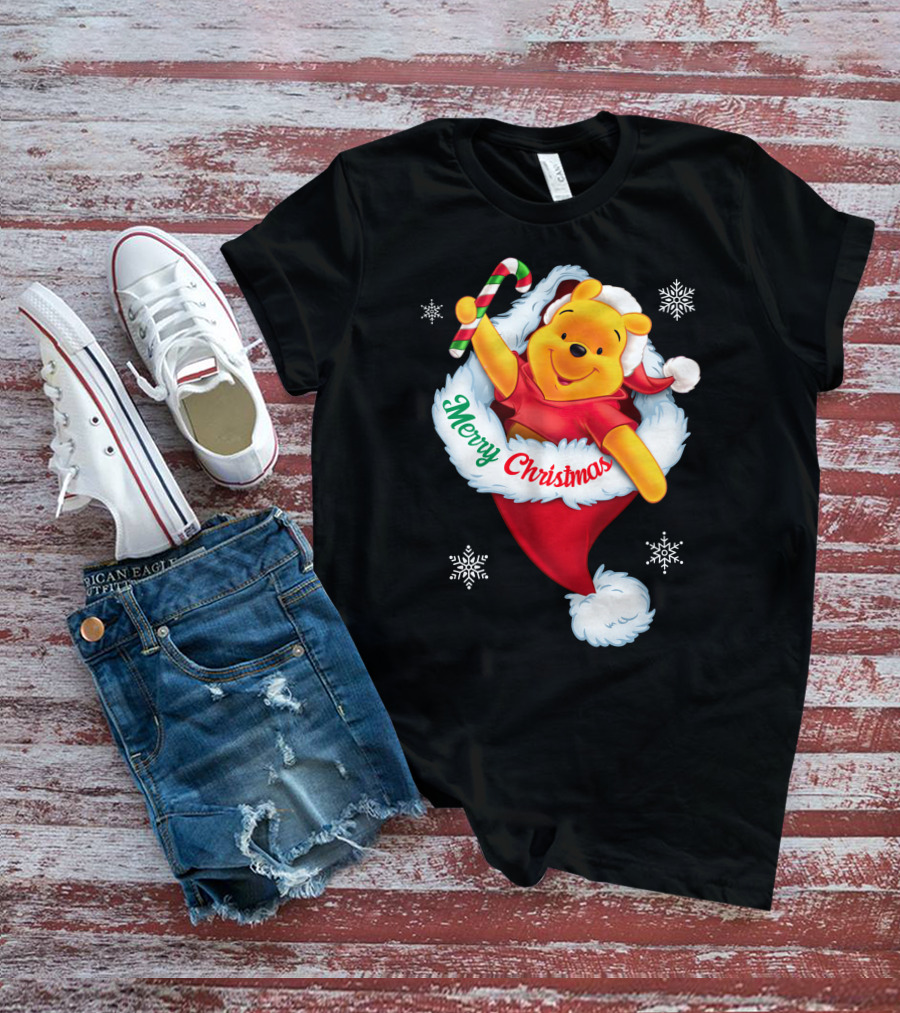 Winnie The Pooh Merry Christmas Santa Hat Candy Cane T-Shirt