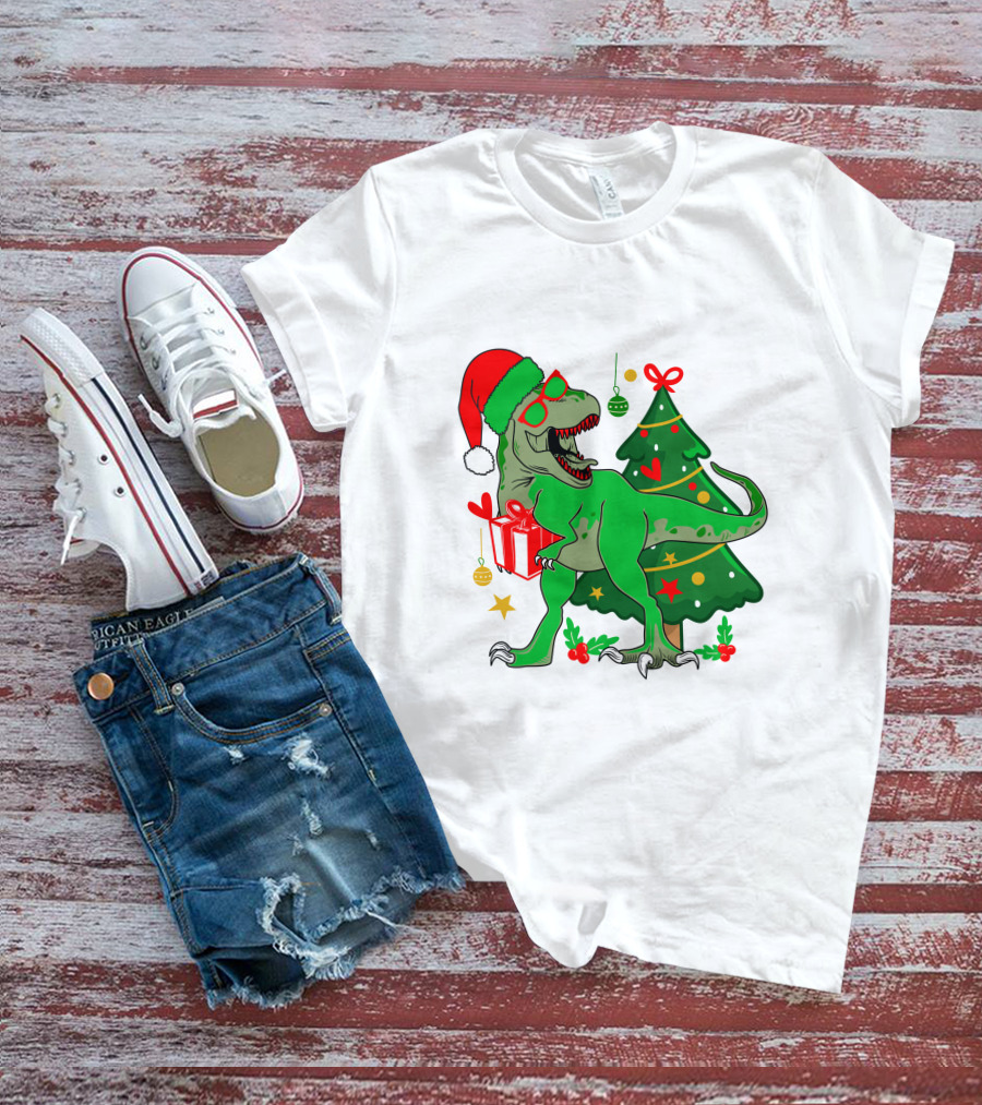 Christmas Dinosaur Santa With Tree And Gift T-Shirt
