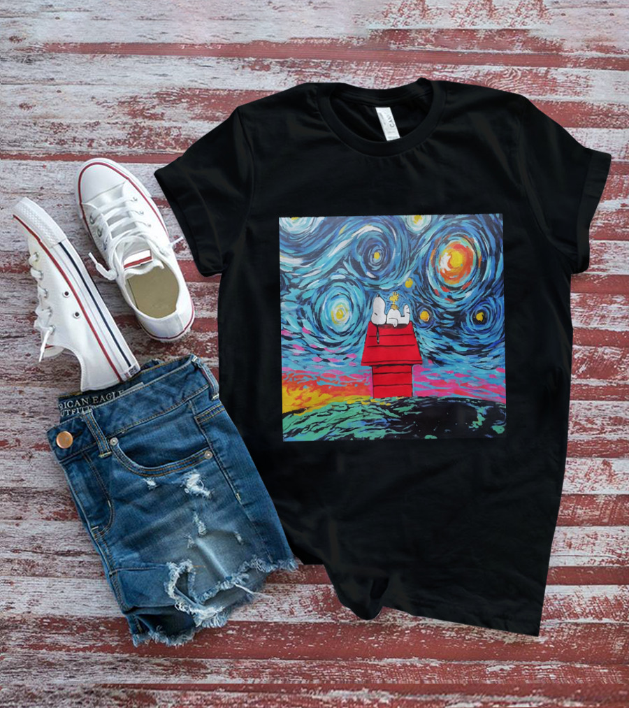 Snoopy And Woodstock On The Doghouse Under A Starry Night T-Shirt
