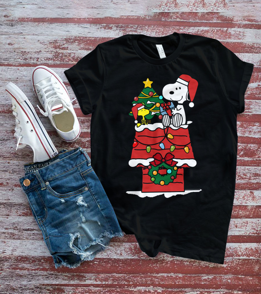 Snoopy And Woodstock Celebrate Christmas On Doghouse With Santa Hats And Tree T-Shirt