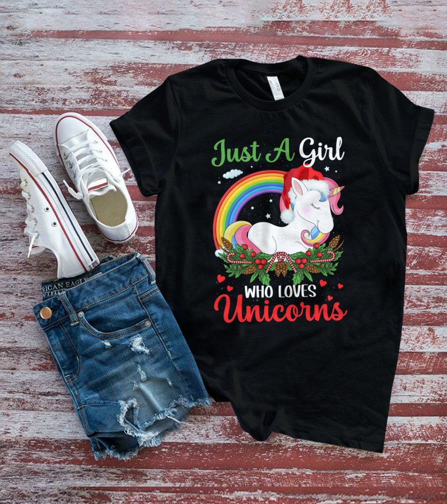 Just A Girl Who Loves Unicorns Rainbow Christmas Santa Hat T-Shirt
