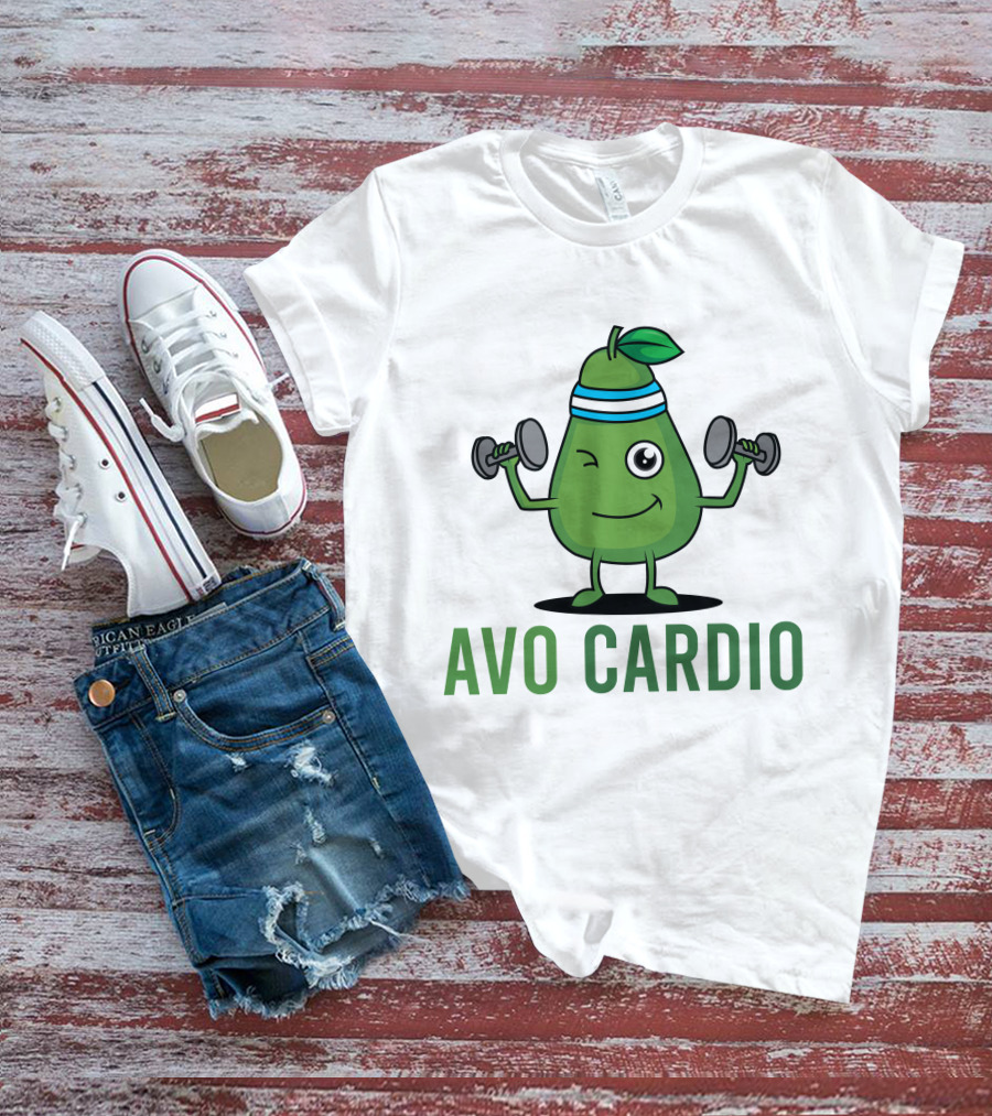 The Avo Cardio Winking Avocado Dumbbell Workout Shirt offers a regular fit. Made from 100% ring-spun cotton that is pre-shrunk to help maintain size and shape after washing. Features reinforced construction details for durability. Available in U.S. standard sizes S-5XL to accommodate various body types.